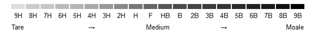 * Duritatea creionului difera de la H=hard (sau forte) pana la B=black si se numeroteaza de la 1 la 7 (7B=cel mai moale)