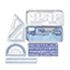linie, radiera, ascutitoare, raportor, creion, sablon cu litere si cifre si doua echere